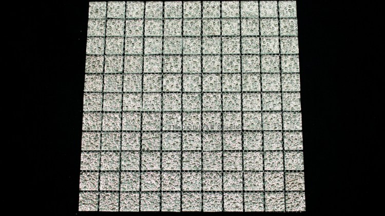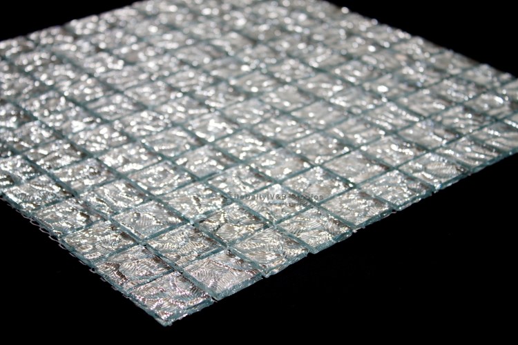 The tiles have a clear, smooth and glossy glass surface with a layer of silver below that carries the embossed pattern. The glass itself is not cracked. These are great looking tiles that can be used in bathrooms, shower walls, kitchen backsplashes, etc. In commercial spaces they can also be used in boutiques, fashion stores, or other environments where a trendy atmosphere is desired. Additionally, they can also be used in between other tiles as keys or liners, where the sheets can be cut to smaller sizes and used to create patterns mixed with other tiles. The glass however is thinner on these.