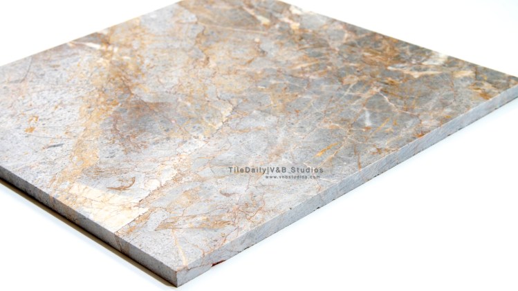 Natural stone has a beautiful array of naturally occuring patterns and colors, and this marble is a beautiful example. It has fine cracks and lines running through grey colored stone with a nice mix of yellow and gold colored veins running throughout the tile. Stare at the tiles long enough and you may also discover fossils hidden in the layers.