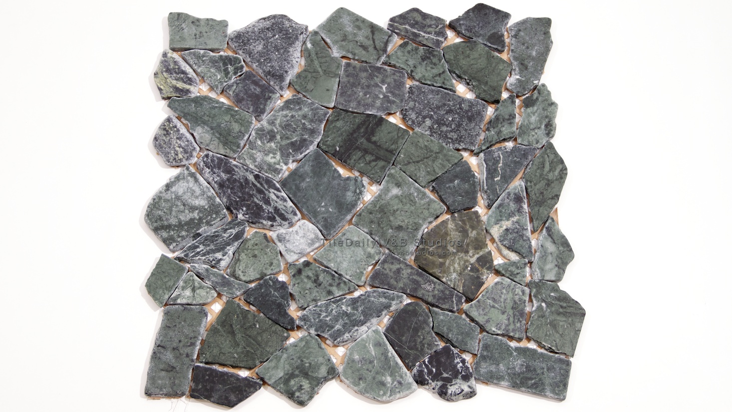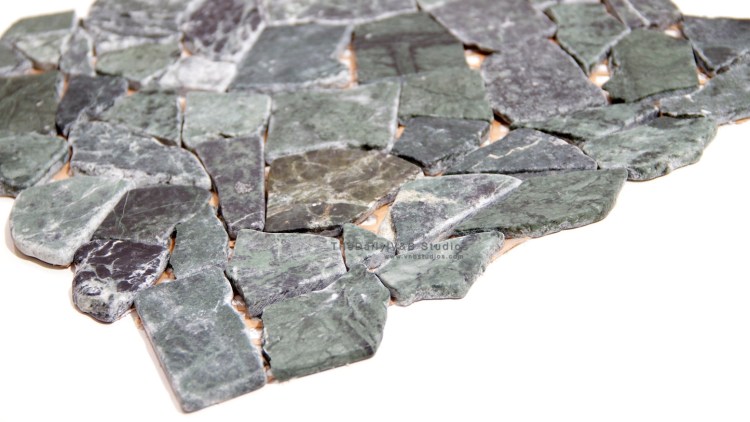 This beautiful mosaic is made from tumbled, jade green marble. The mosaic is put together from random cut marble pieces ranging from 1 – 2 inches in size. The marble is all natural stone, with a mix of green colors, and light and dark veins running through them.