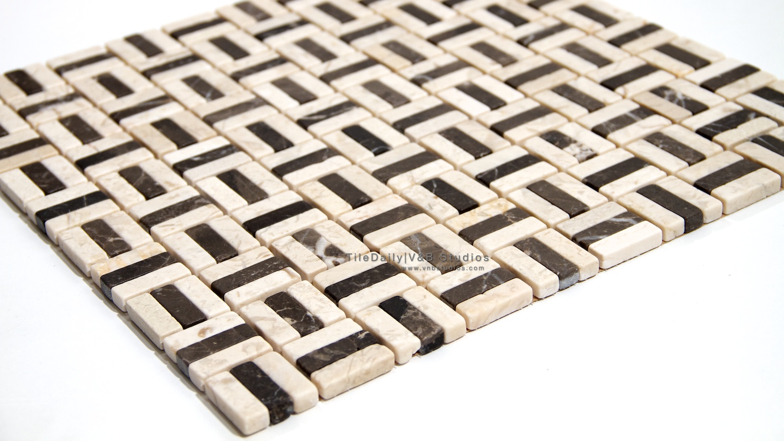 Today’s mosaic is a mix of botticino marble and emperador dark marble. The finish is tumbled, and can be darkened if you use an enhancer sealer. It is recommended to use a stone sealer to protect the look of stone and against acid or residue.