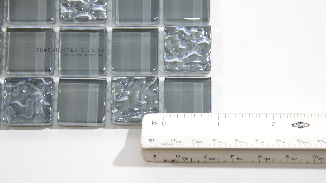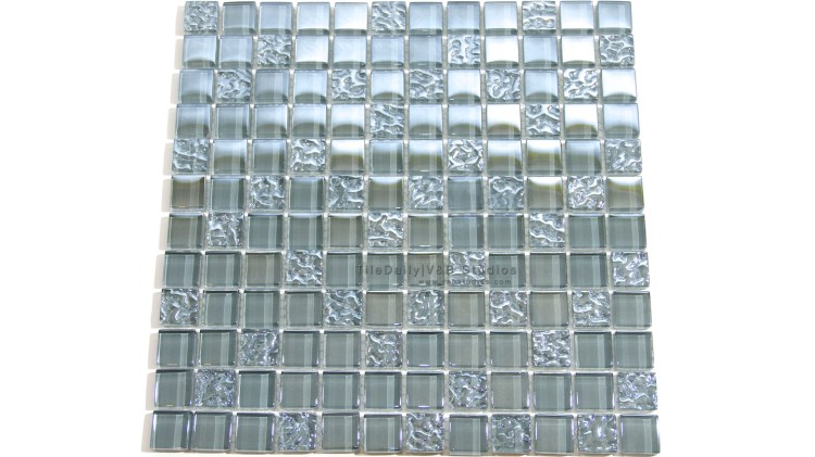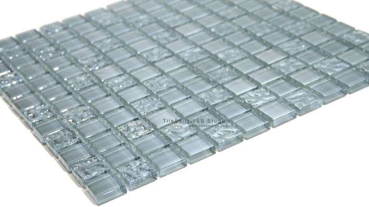 This is a beautiful glass mosaic tile comprising of iridescent grey squares. The mosaic is a mix of smooth, glossy and wavy glass squares, all with the iridescent grey color. There are also slight color variations in the grey, which add to the overall look and character of this tile.