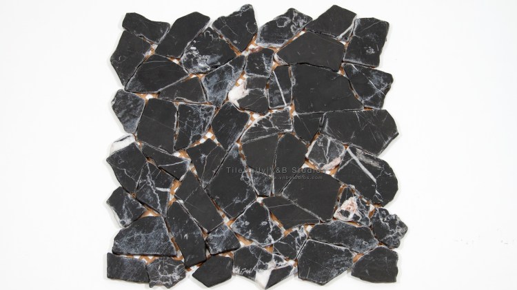 These mosaics are manufactured from natural marble, and come with a tumbled finish. They are made from Nero Black marble and White Carrara marble. Both tiles feature natural veins running through them. The mosaic is put together from random cut / broken marble pieces ranging from 1 – 2 inches in size.