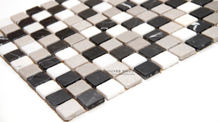 Up today is an inch square mosaic made from a natural stone mix of nero marble, grey carrara and thassos white. The tile is created with a natural, tumbled finish.