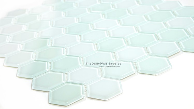 Today’s tile is a beautiful hexagon glass mosaic in a very light green shade.  It actually features the natural color of glass.  The size of each hexagon piece is 1.5 inches and features a clean, glossy surface.  This mosaic is for wall use, and can be used for swimming pools as well.  Generally, this is a great mosaic tile for bathroom, showers, etc., and for both residential and commercial uses.  They can also be used in kitchens and other rooms as backsplashes.