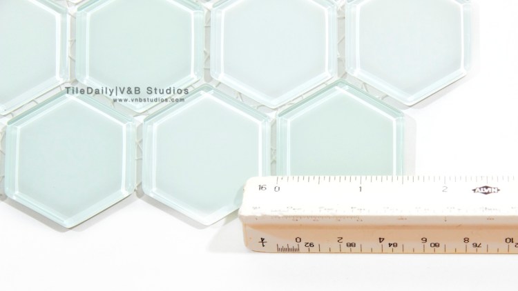 This hexagon glass mosaic comes in 12×12 sheets and is also available in other colors.  To see them or for samples, please call/email us.  We also have a variety of hexagon porcelain tiles available on our site.
