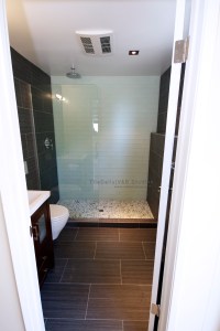 12×24 size, white thinset behind the glass, and a light grey grout. – although you can match colors of brown, etc.