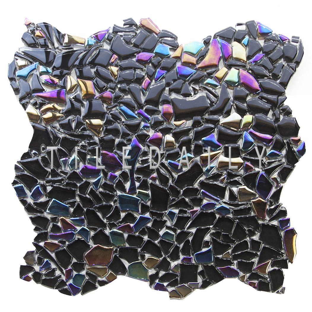 Front full view. This mosaic comes in black with iridescent coloring and highlights. A great choice for edgy and modern designs. ©TileDaily