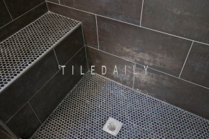 Metallic Iron Shower Wall and Penny Round Shower Floor