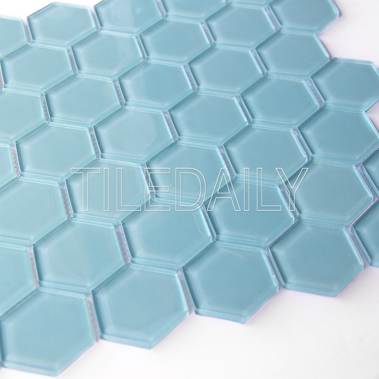 Tile code: GM0134LTQ – 2″ Hexagon Glass Mosaic Tile, Light Turquoise