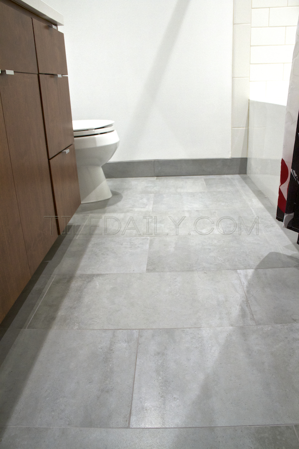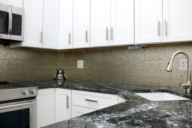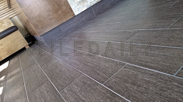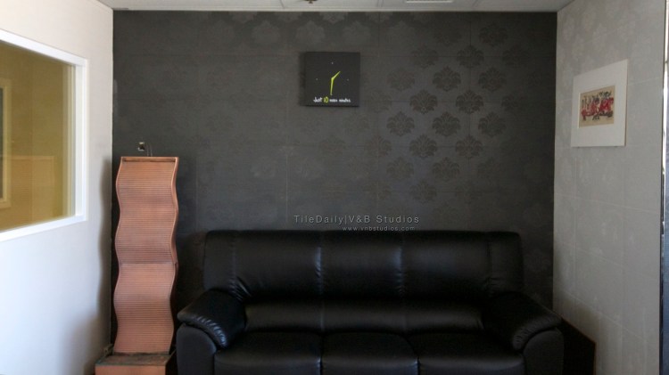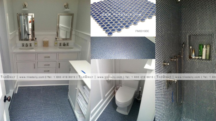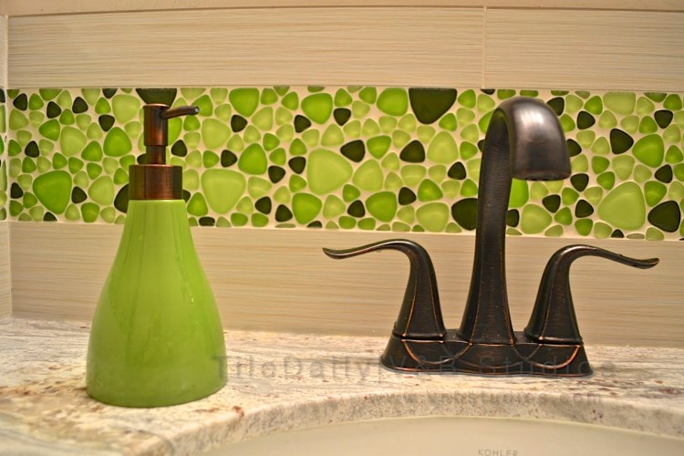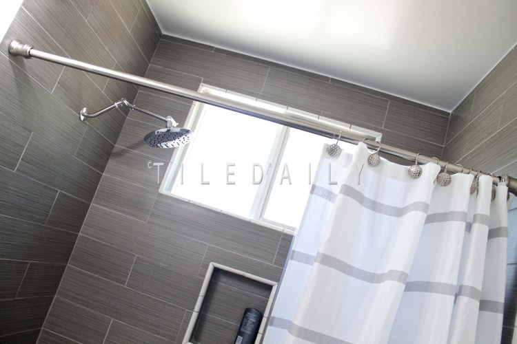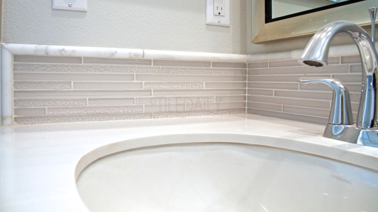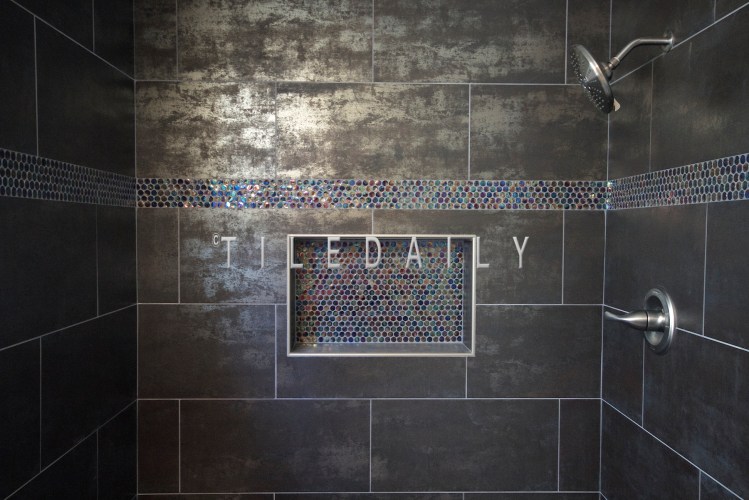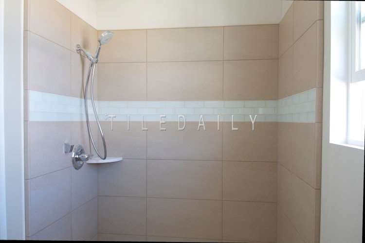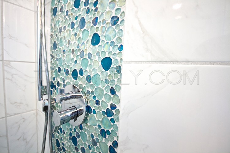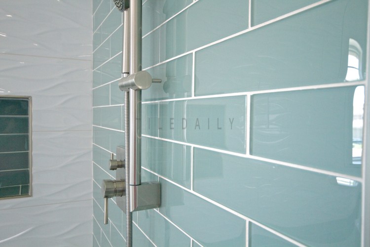Beautiful installation of wave ceramic tile and light blue glass subway tile.